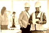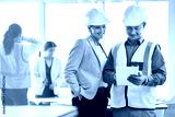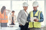 Man, woman and tablet in office for architecture analysis, construction teamwork or vision. Architect team, contractor or reading for property development, real estate or building project on app ux
