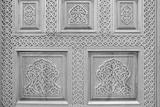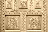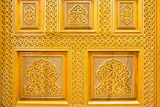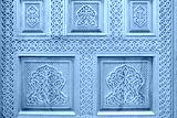 Carved wooden doors with patterns and mosaics. Abstract background.