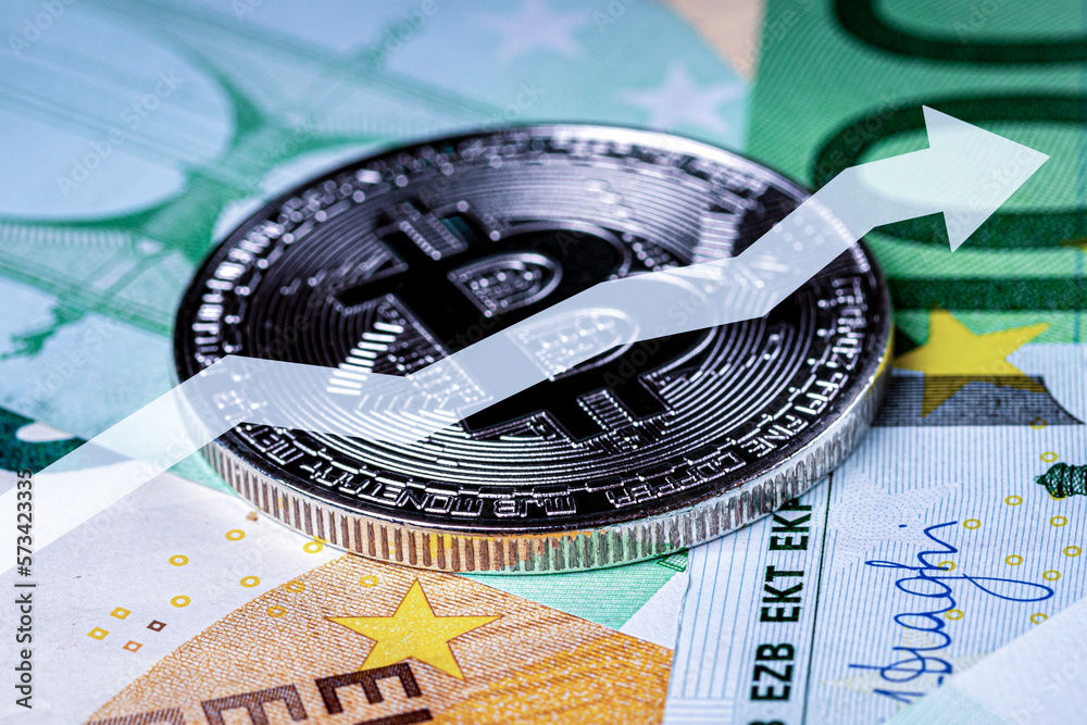 Bitcoin and dollar bills. BTC market symbol cryptocurrency rising above the united states dollar. Bitcoin price growth concept.