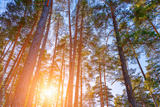 Sunset or sunrise in the spring pine forest covered with a snow. Sunbeams shining through the tree trunks.