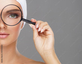 Face of young and beautiful girl and a magnifying glass.