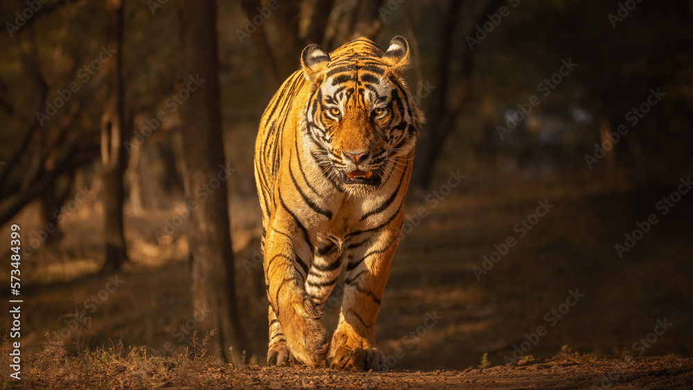 Amazing tiger pose during the magical light time. Wildlife scene with danger animal. Hot summer in India. Dry area with beautiful indian tiger. Panthera tigris.