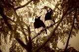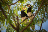 Beautiful oriental pied hornbill on a tree in Kaziranga. Giant hornbill bird on a tree. Indian wildlife birding. Anthracoceros albirostris.