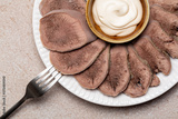 Sliced beef tongue on the plate, mayonnaise sauce. Cold meat snack. Close-up.