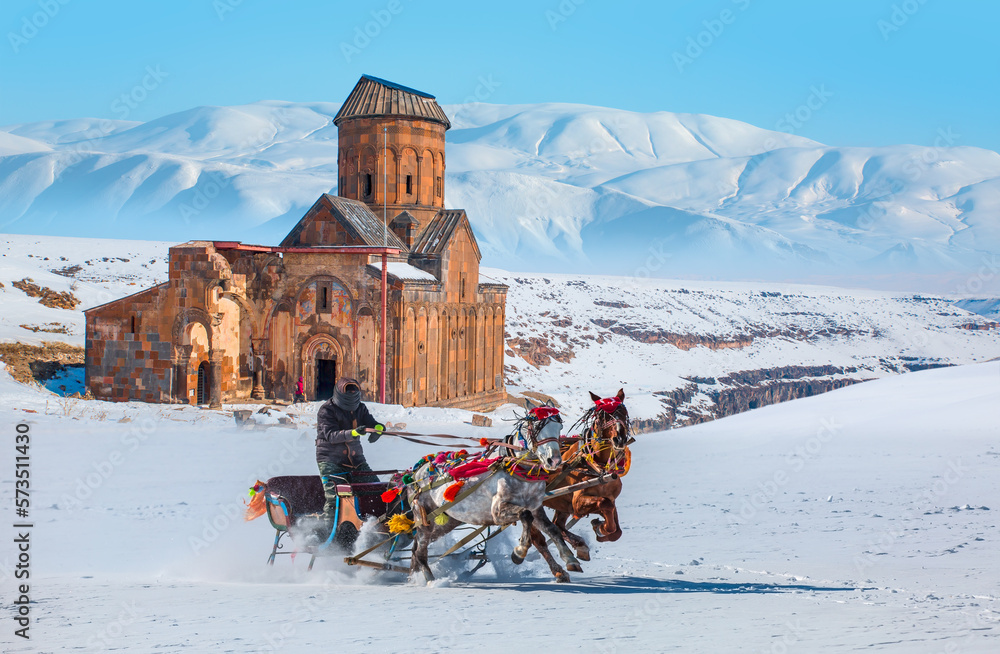 Horses pulling sleigh in winter - Ani Ruins, Ani is a ruined and medieval Armenian city - Kars, Turkey