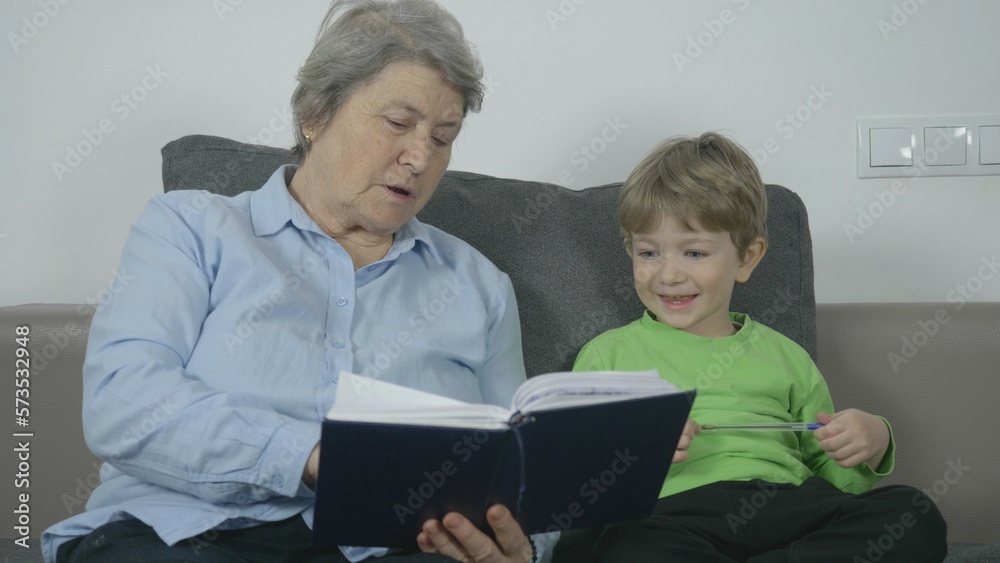Grandmother laughing while reading a funny tale from a book to her grandson