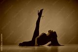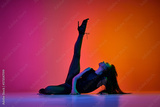 Passion and femininity. Young female dancer performing modern dance style over gradient pink orange studio background in neon light. Concept of contemporary dance style, art, aesthetics, creativity