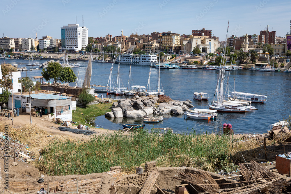 Felucca Sailing on the Nile River in Aswan. Popular Tourist Sailboat in the Nile. Aswan, Egypt. Africa.