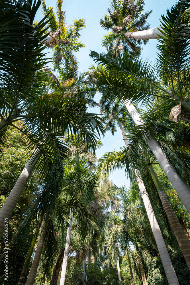Green palm trees with spreading leaves. Wide viewing angle.
