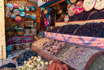 Egiptian Spices and Herbs at Traditional Arab Oriental Bazaar at Nubian Village. Aswan. Egypt. Africa.