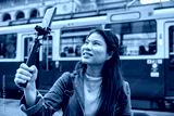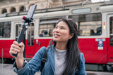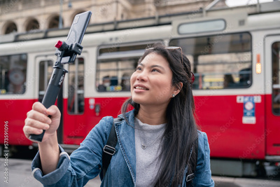 Young casual woman using smartphone to record journey with smile. Happy and excited asian girl traveler wear stylish cloth with hand gesture waving to internet audience. Influencer vlogging concept