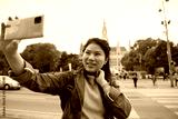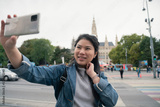 asian female woman traveller enjoy holiday vacation city walking hand using smartphone taking photo herself with background of Vienna City Hall in the Historic City Center tour in Vienna Austria
