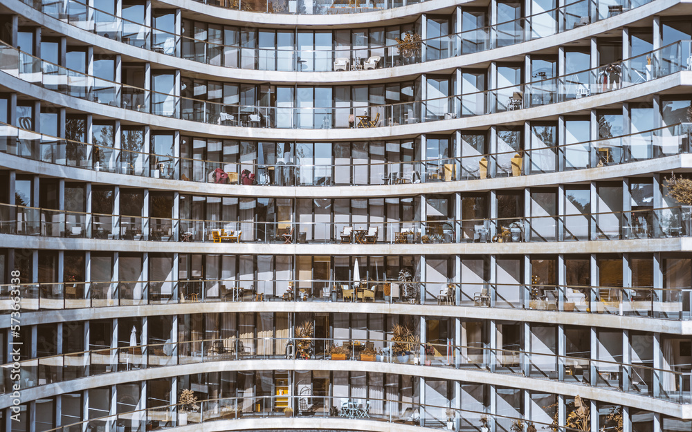 A glass-in facade of a white high-rise residential edifice with transparent balcony railings and windows in a pattern; a textured background of hotel rooms adjacent to each other on a sunny day