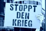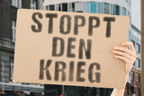The phrase " Stop the war " is on a banner in men's hands with blurred background. Troops. Hostility. Aggression. Fighting. Attack. Defense. Survival. Hope. Relief. Assistance. Victims. Refugees