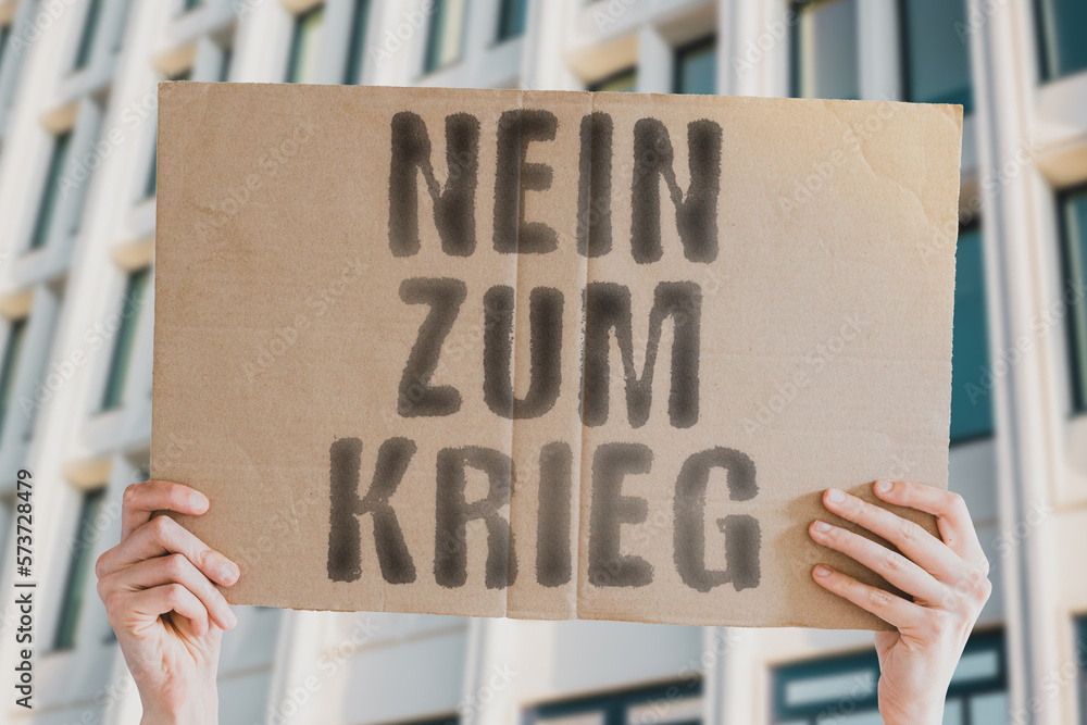 The phrase " No to war " is on a banner in men's hands with blurred background. Resolution. Compromise. Reconciliation. Treaty. Ceasefire. End. Hostilities. World. Community. Global. Humanity. Voice