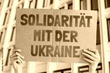 The phrase " Solidarity with Ukraine " is on a banner in men's hands with blurred background. Movement. Change. Hope. Future. Courage. Bravery. Pride. Resilience. Faith. Strength. Respect. Memorial