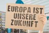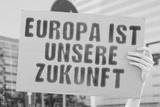 The phrase " Europe is our future " is on a banner in men's hands with blurred background. Activism. Protest. Rally. March. Demonstration. Strike. Resistance. Voices. People. Society. Culture. Identit