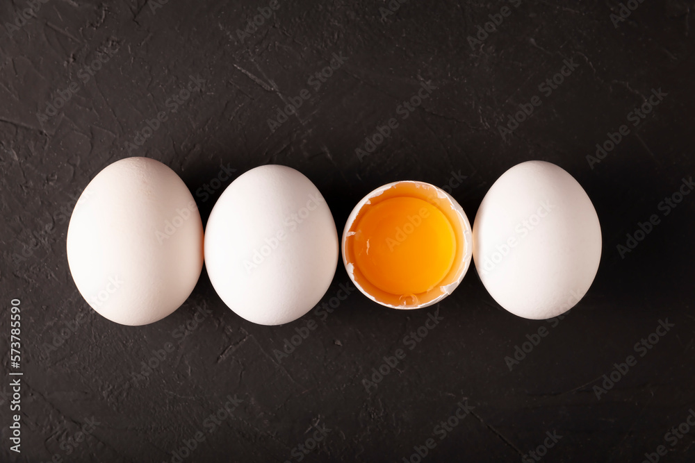 White chicken eggs and egg yolk in a row on black texture. Very popular nutritious and economic food product. Concept image. Top table view.