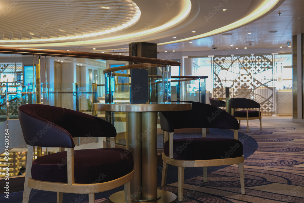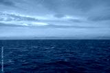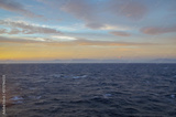 Massive freak wave spray from bow of cruiseship cruise ship liner at sea during Transatlantic Ocean crossing passage on sunny sunset sunrise twilight blue hour day