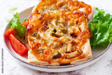 Children mini pizza , small open pies with ham, tomato sauce, mozzarella and cheese in basket on a light background.
