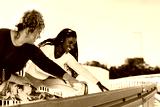 Two young plus size women stretching together before running.