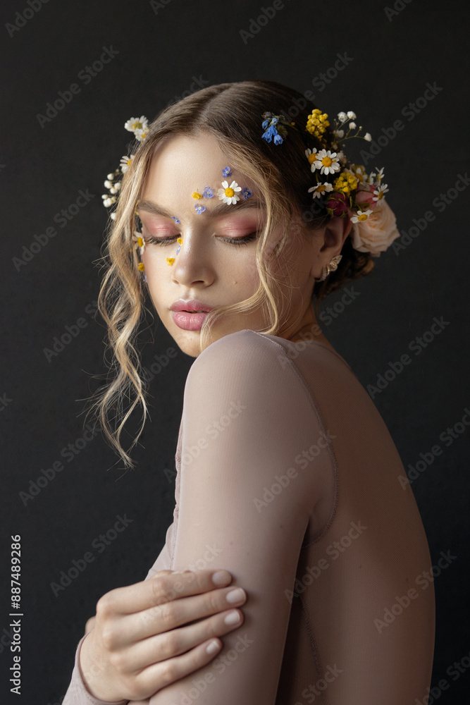 Beauty face woman makeup rhinestones lips. Contrasting portrait of a beautiful woman, wet hair styling. Clean facial skin