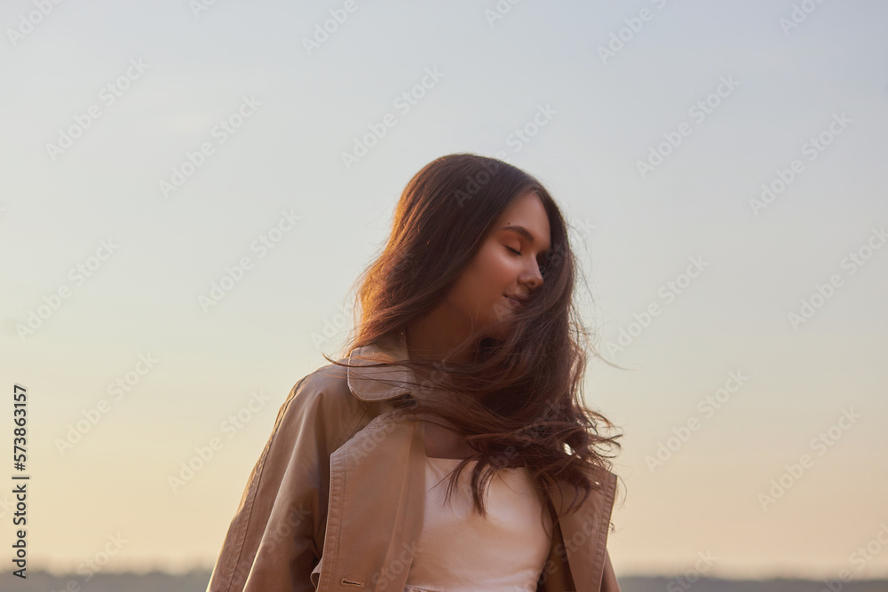 Portrait of a beautiful young woman at sunset. Natural beauty, long hair, woman in a raincoat