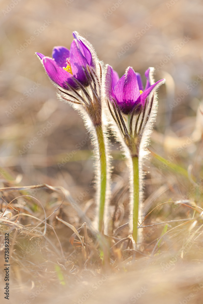 Dream grass flowers (Pulsatilla patens). Spring background, postcard.