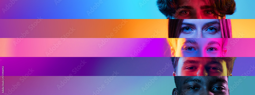 Collage. Close-up images of male and female eyes, people over multicolored background in neon lights. Eyes places in narrow stripes. Concept of human diversity, emotions, equality, human rights, youth