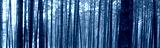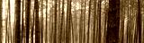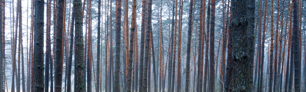Panorama of pine autumn misty forest. Rows of pine trunks shrouded in fog on a cloudy day.
