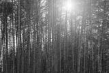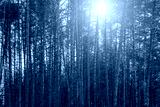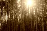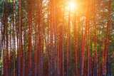 Sunset or sunrise in the spring pine forest covered with a snow. Sunbeams shining through the tree trunks.