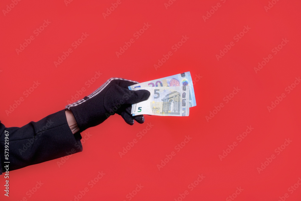Euro banknotes in a female hand in a glove. On a red background. five and twenty euros