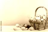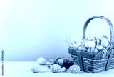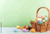 Happy easter, Easter painted eggs in the basket on wooden rustic table for your decoration in holiday. copy space.