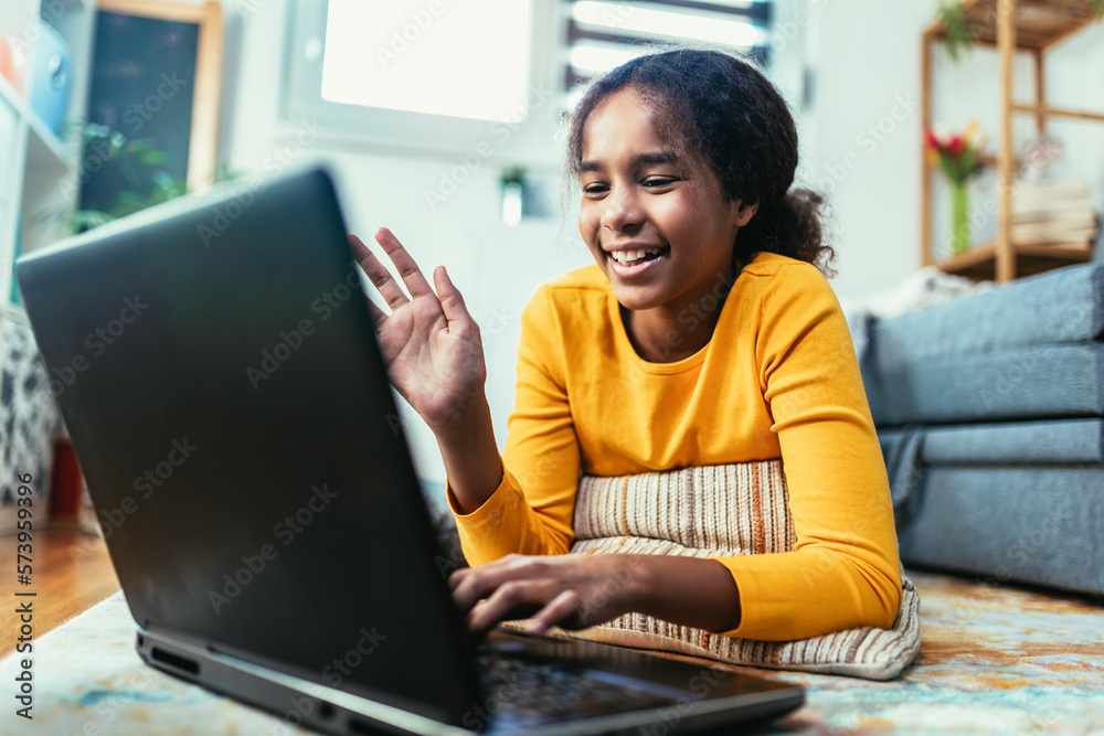 Smiling school African American girl watching the video lesson on computer,happy child have online web class using laptop at home, homeschooling concept
