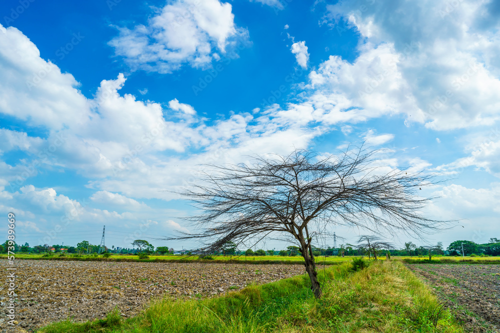 Trees are left with branches Silhouettes of trunks and branches a meadow soil in a rice field with fluffy clouds blue sky daylight background.