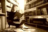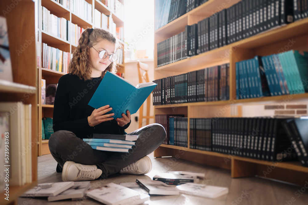 Teen girl among a pile of books. A young girl wearing glasses reads a book with shelves in the background. She is surrounded by stacks of books. Book day.
