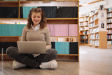 Teenage girl with a notebook in her hands. She is surrounded by stacks of books. Book Day.