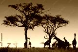 Giraffes near the acacia tree at the sunset