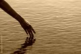 Woman's hand touching calm water surface. Feeling of peace and zen in nature.