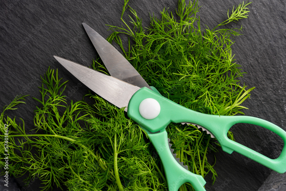 kitchen scissors cutting dill in the kitchen on a cutting board