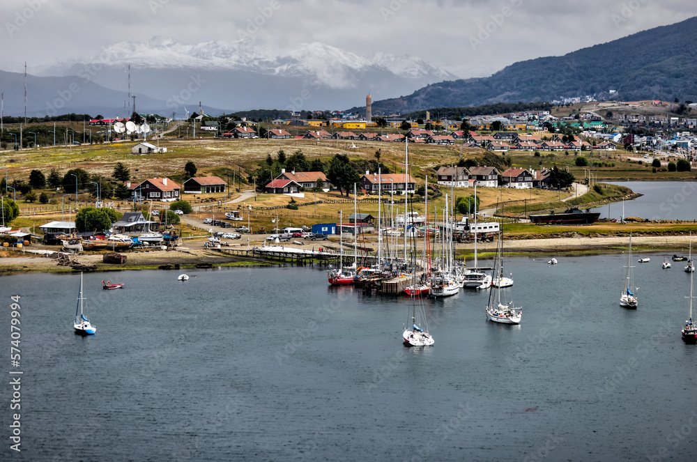 The harbour and shoreline of Ushuaia in the Beagle Channel, Tierra del Fuego, southern Argentina