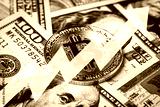 Bitcoin and dollar bills. BTC market symbol cryptocurrency rising above the united states dollar. Bitcoin price growth concept.