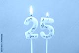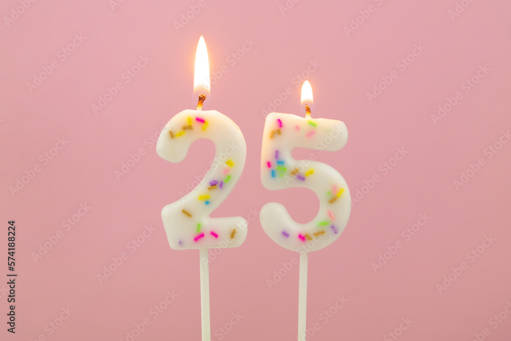 Burning white birthday candles on pink background, number 25
