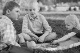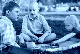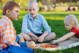cute caucasian children sitting on grass in park having lunch eating pizza outdoors after school.