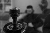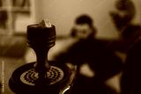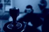 Hookah shisha with glass flask and metal bowl in room with man background and copy space and empty place for text. Traditional Eastern vacation for relaxation