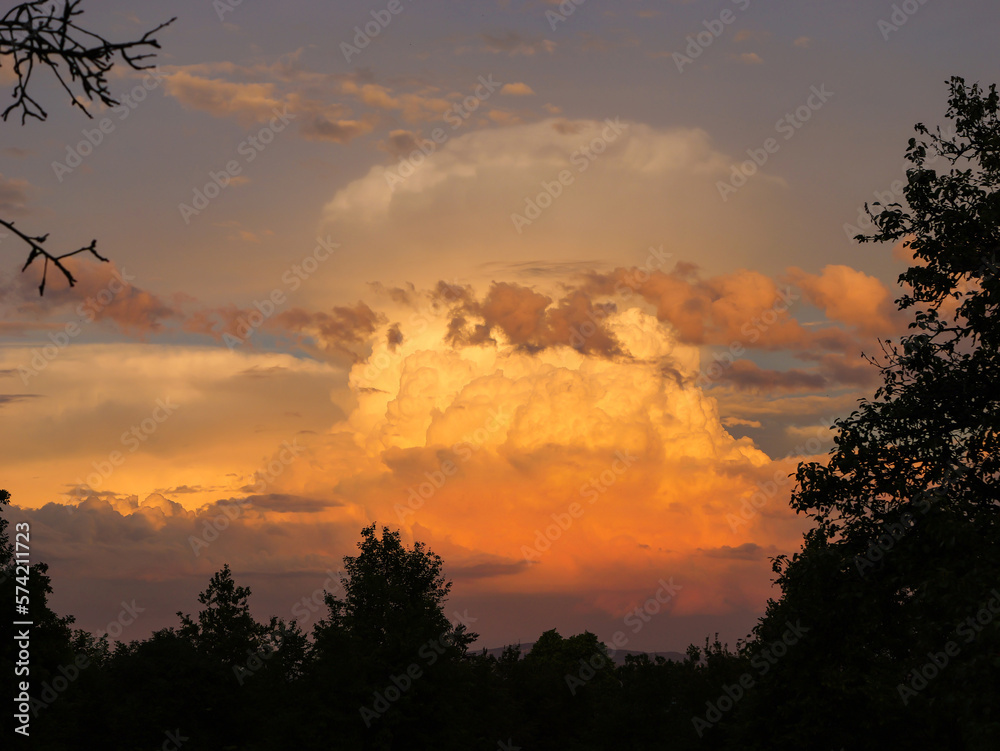 Enormous cumulonimbus cloud above treetops, glowing in beautiful sunset colours
