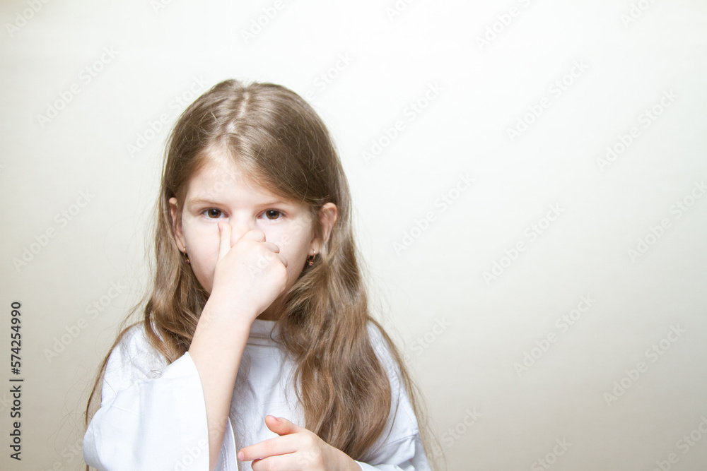 A cute little girl with loose wavy hair in casual clothes covers her mouth and nose with her hands with a painful expression on her face due to a toothache or a stuffy nose. Dentist