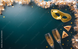 Happy Purim carnival decoration concept made from golden mask star and glitter on dark background. (Happy Purim in Hebrew, jewish holiday celebrate)