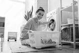 Young woman smiling at camera while putting clothes in washing machine in laundry room.