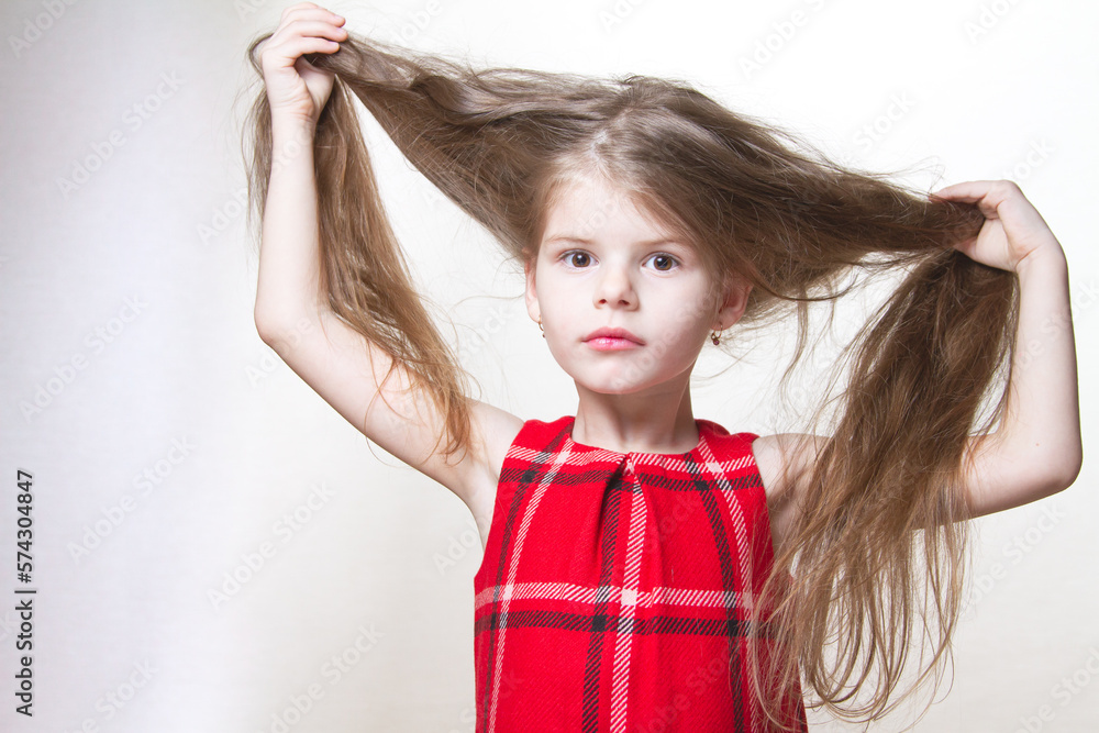 Portrait of a cute little blonde woman dressed in a red plaid dress showing emotions, screaming and pulling her hair. Emotions, panic and fear in her eyes